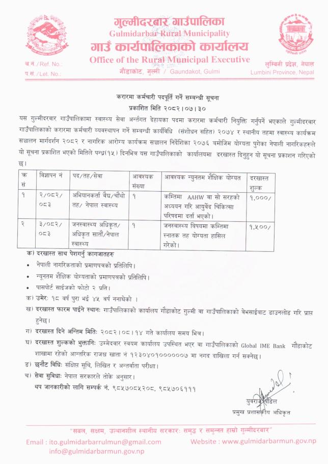 अभियानकर्ता वैद्य (विज्ञान नं.०२/०८२/०८३) र जनस्वास्थ्य अधिकृत(विज्ञान नं.०३/०८२/०८३) करारमा कर्मचारी पदपूर्ति गर्ने सम्बन्धी सूचना।