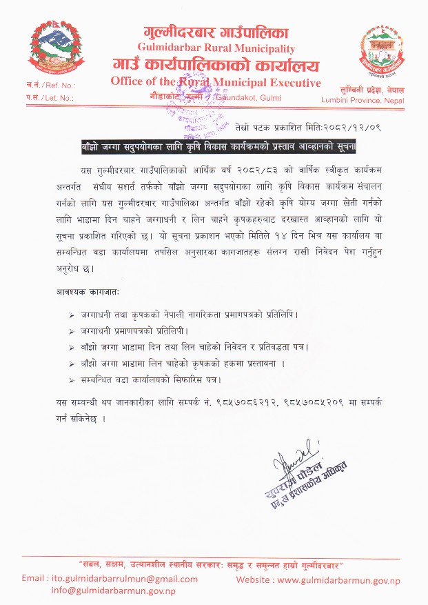 बाँझो जग्गा सदुपयोगका लागि कृषि विकास कार्यक्रमको प्रस्ताव आह्वानको सूचना।