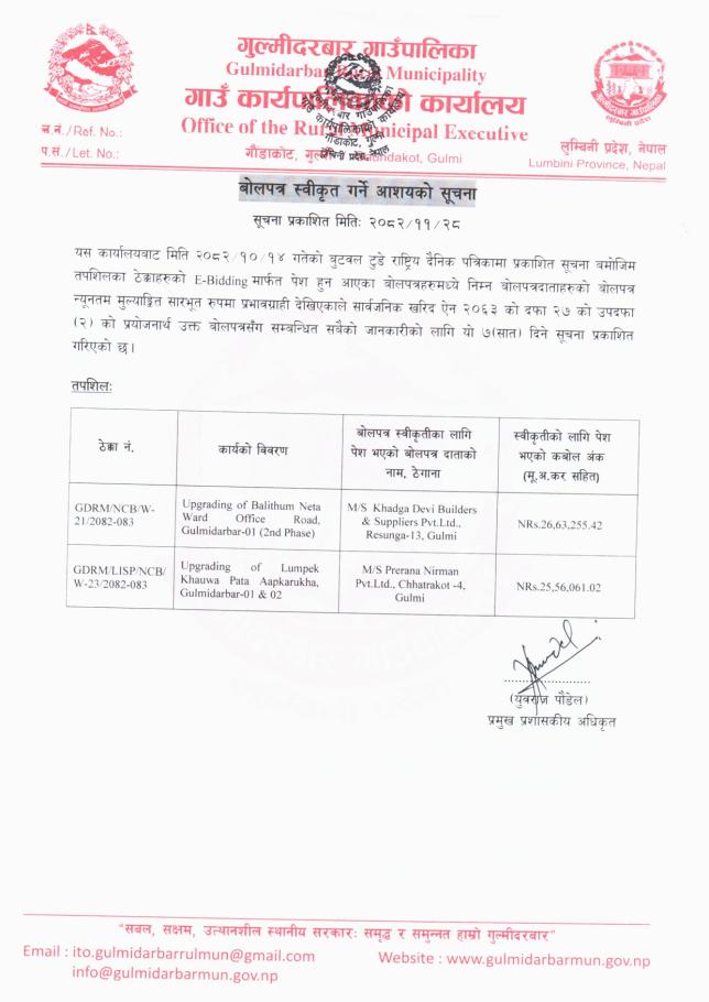 बोलपत्र स्वीकृत गर्ने आश्यको सूचना ।