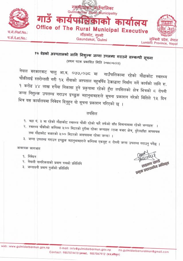 » १५ वेडको अस्पतालको लागि निशुल्क जग्गा जग्गा उपलब्ध गराउने सम्बन्धी सूचना