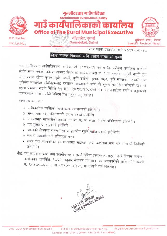 कोल्ड च्याम्बर निर्माणको लागि प्रस्ताव आह्वानको लागि सूचना