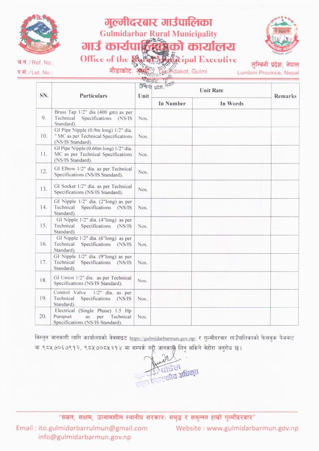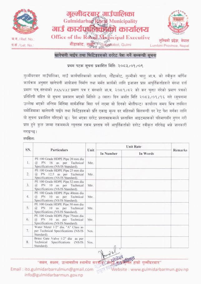 » खानेपानी पाईप तथा फिटिङ्गहरुको दररेट पेश गर्ने सम्बन्धी सूचना ।