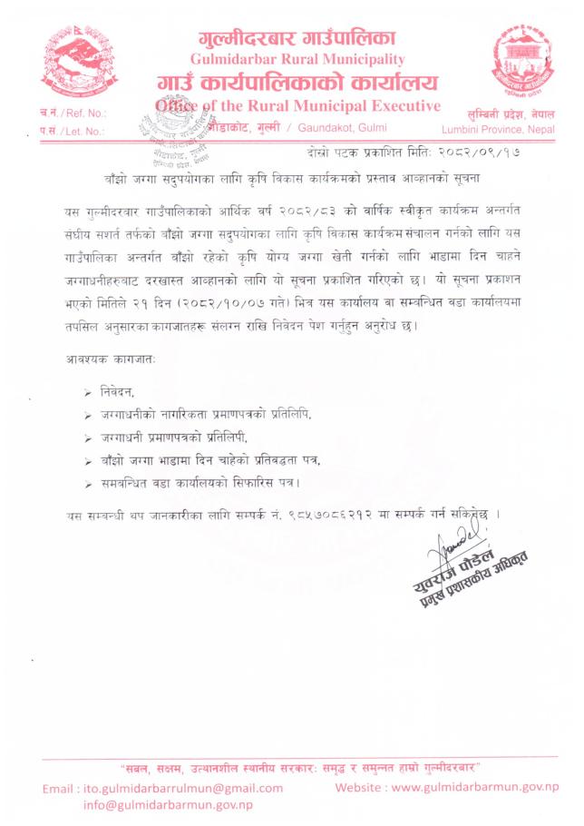 » बाँझो जग्गा सदुपयोगका लागि कृषि विकास कार्यक्रमको प्रस्ताव आह्वानको सूचना