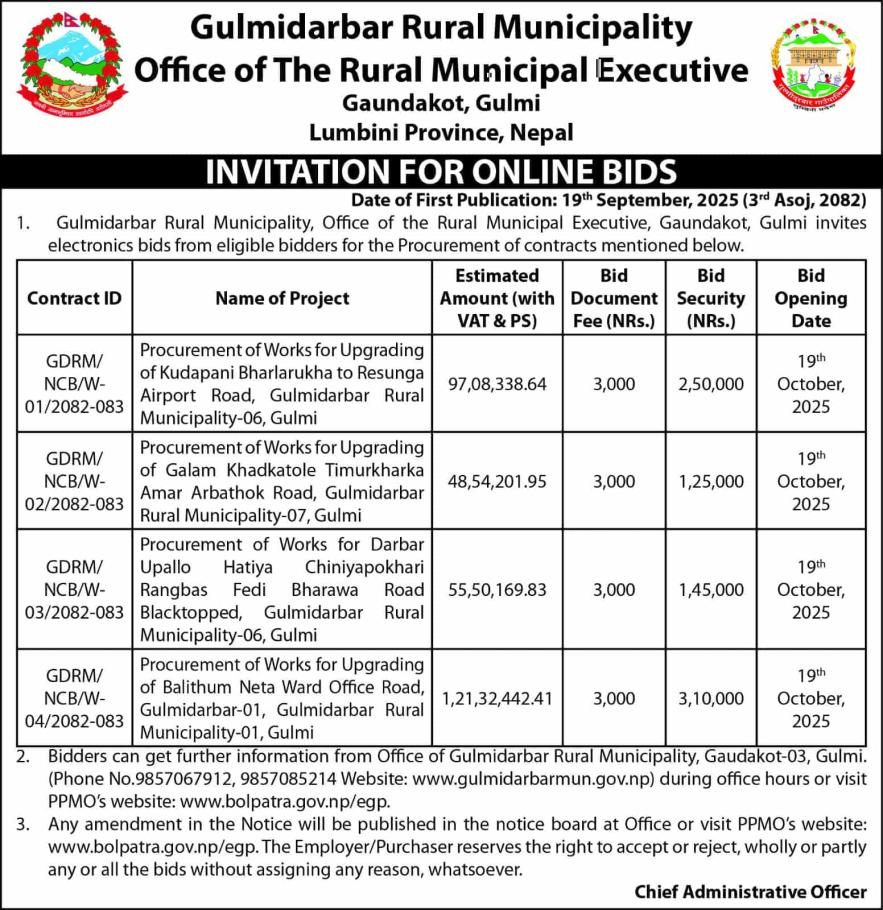 Invitation for Online BIDS Contract ID: GDRM/NCB/W-16/2081-082 (Published on Butwal Today Date: 2082-03-32 )