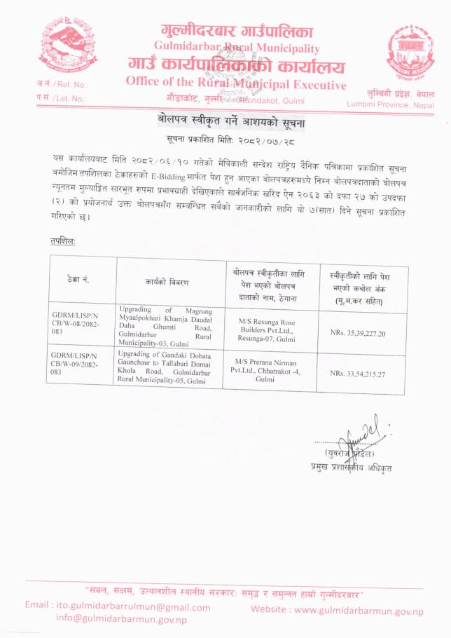 » बोलपत्र स्वीकृत गर्ने आशयको सूचना ।