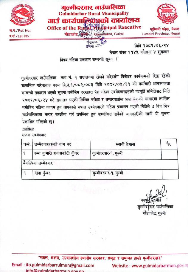 विज्ञापन नं. १/०८२/०८३ गरिवसँग विश्वेश्वर कार्यक्रम अन्तर्गत सामाजिक परिचालक पदको नतिजा प्रकाशन सम्बन्धी सूचना ।