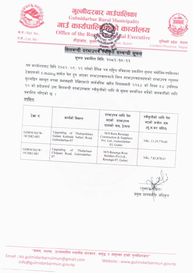बोलपत्र स्वीकृत गर्ने सम्बन्धी आश्यको सूचना ।