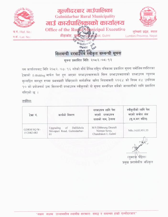 बोलपत्र स्वीकृत गर्ने सम्बन्धी आश्यको सूचना ।