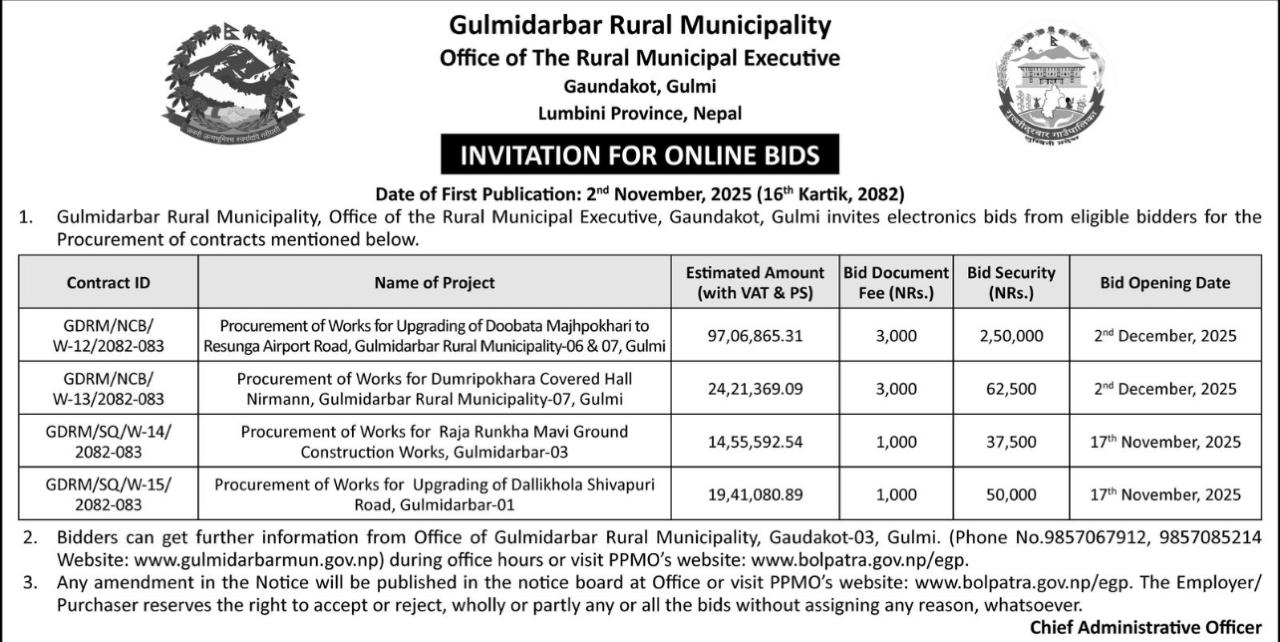 बुटवल टुडेमा मिति २०८२ /०८/१२ गते प्रकाशित सूचना अनुसार बोलपत्र आह्वान सम्बन्धी सूचना।