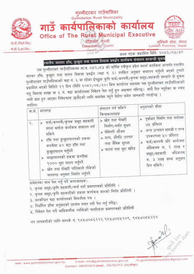 » स्थानीय जातका हाँस कुखुरा तथा मत्स्य विकास प्रवर्द्धन कार्यक्रम संचालन सम्बन्धी सूचना ।